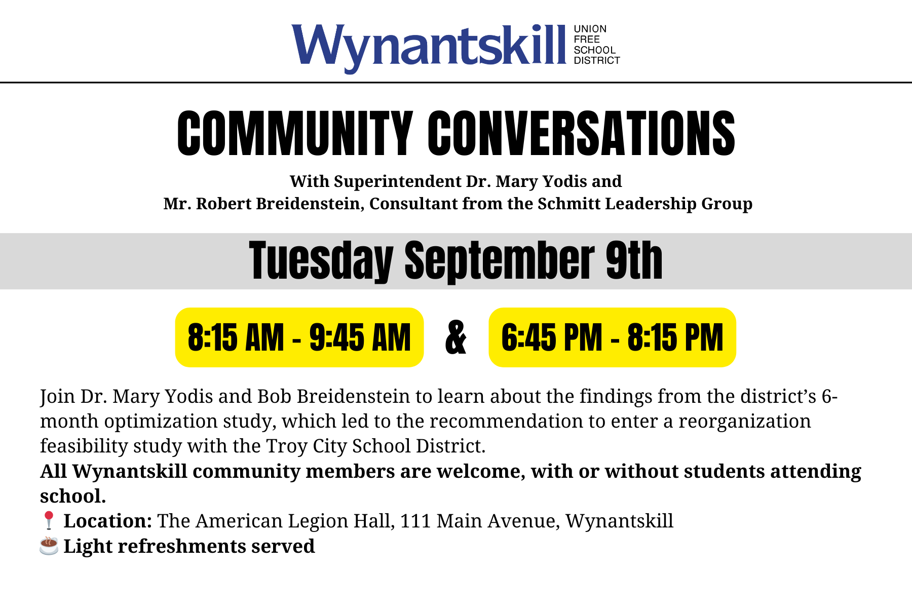 Reminder: The next Community Conversation with Dr. Mary Yodis and Bob Breidenstein will be held on September 9th from 8:15-9:45am and from 6:45-8:15pm at The American Legion Hall, 111 Main Avenue, Wynantskill. They will discuss the findings from the district’s 6-month optimization study; please click here to learn more! https://www.questar.org/feasibility/