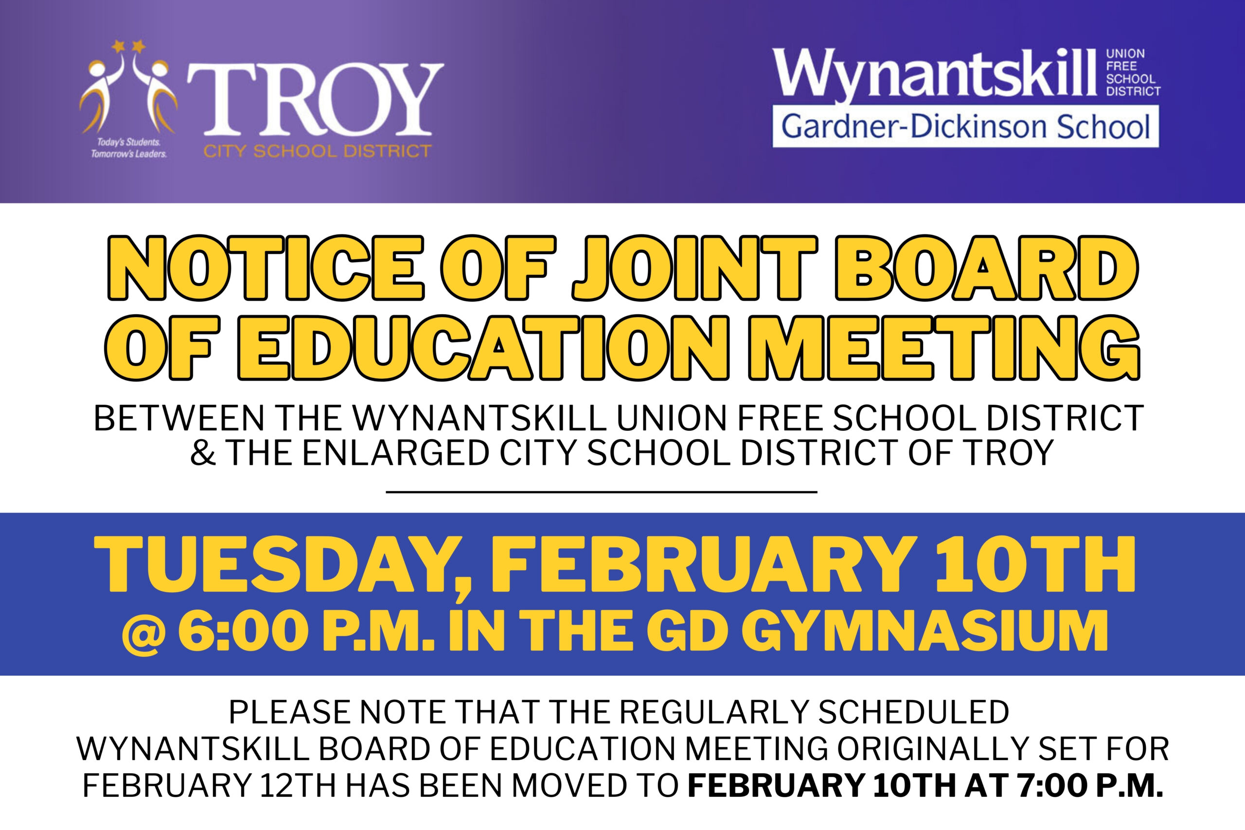 Please note the February 12th Wynantskill Regular Board of Education Meeting will now take place on February 10th at 7:00pm.