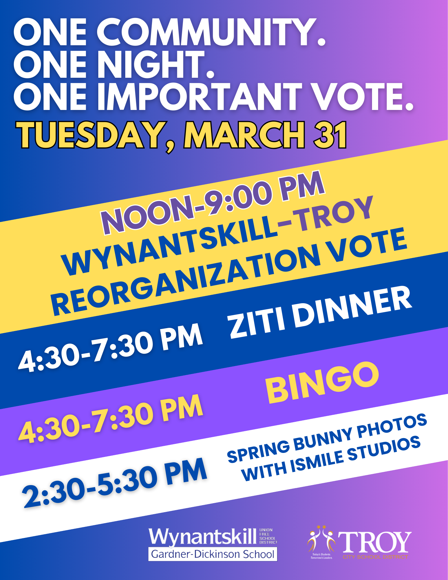On March 31st, Join the Wynantskill PTA and community for an afternoon and evening filled with fun, food, friendship, and important decisions!